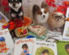 伊達メガネをかけて絵本に囲まれ文学わんこ♪